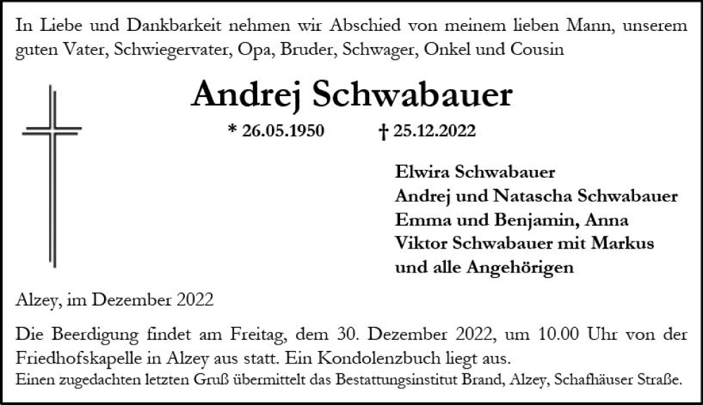 Hier finden Sie alle Traueranzeigen aus der Zeitung, die bisher für Andrej Schwabauer erschienen sind. Weitere Traueranzeigen, die in der Zeitung erscheinen, werden hier ebenfalls aufgelistet