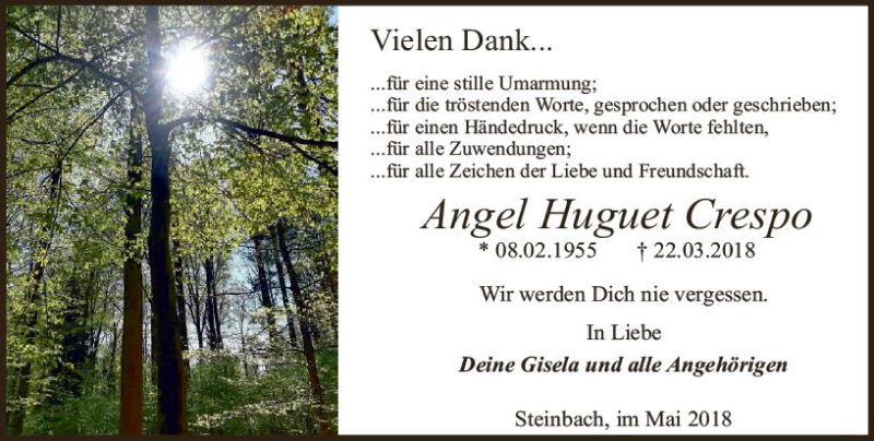Hier finden Sie alle Traueranzeigen aus der Zeitung, die bisher für Angel Huguet Crespo erschienen sind. Weitere Traueranzeigen, die in der Zeitung erscheinen, werden hier ebenfalls aufgelistet