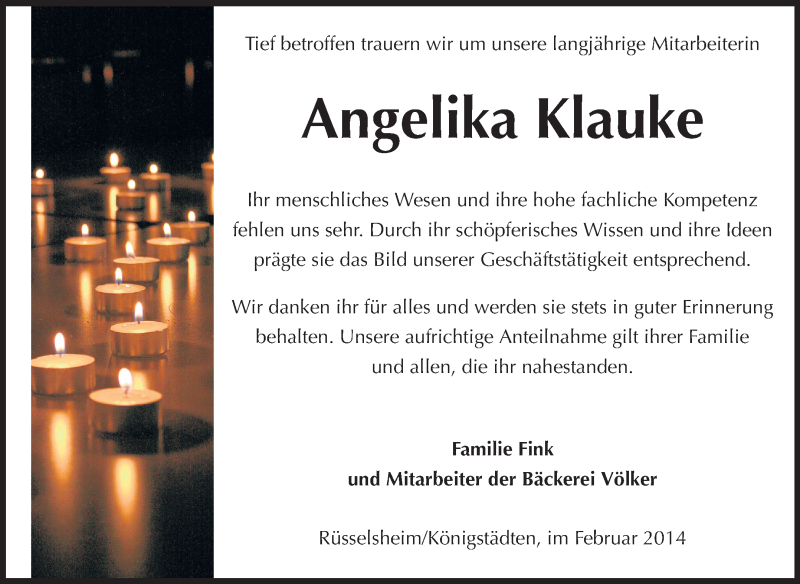 Hier finden Sie alle Traueranzeigen aus der Zeitung, die bisher für Angelika Klauke erschienen sind. Weitere Traueranzeigen, die in der Zeitung erscheinen, werden hier ebenfalls aufgelistet