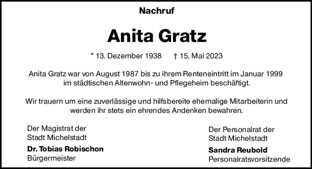 Hier finden Sie alle Traueranzeigen aus der Zeitung, die bisher für Anita Gratz erschienen sind. Weitere Traueranzeigen, die in der Zeitung erscheinen, werden hier ebenfalls aufgelistet