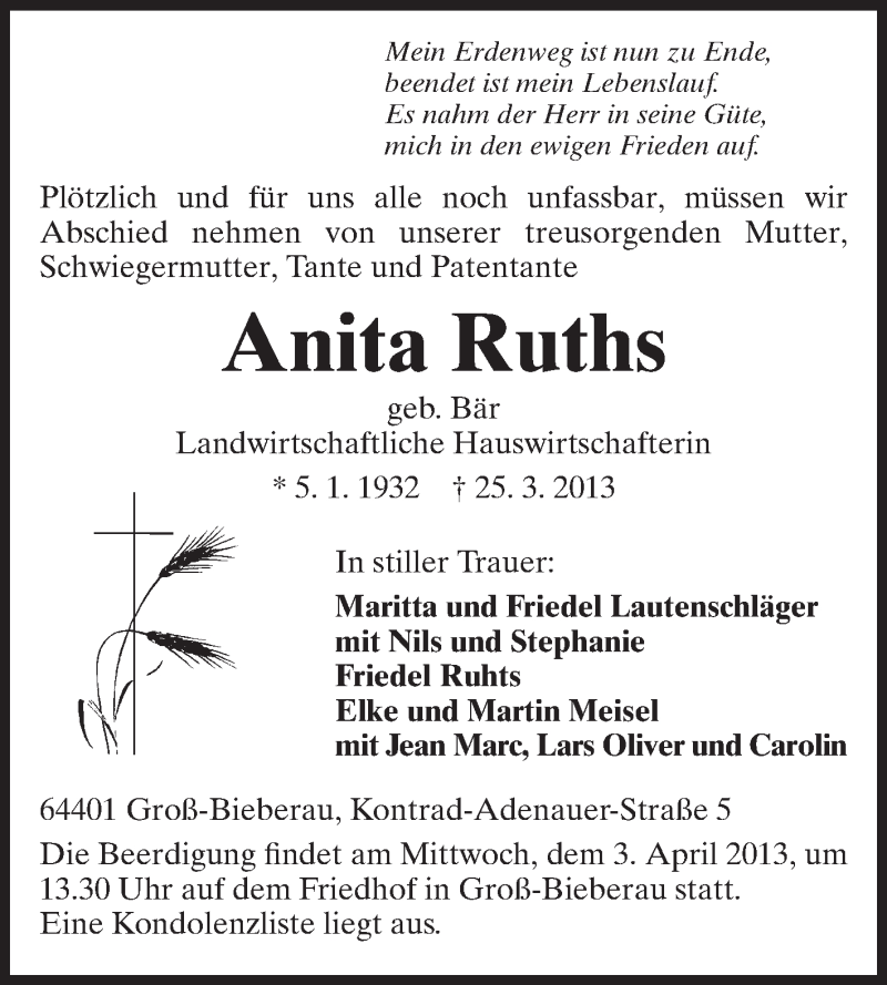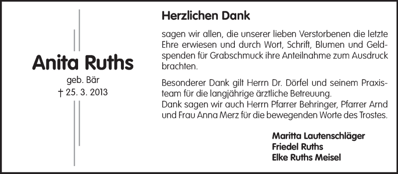 Hier finden Sie alle Traueranzeigen aus der Zeitung, die bisher für Anita Ruths erschienen sind. Weitere Traueranzeigen, die in der Zeitung erscheinen, werden hier ebenfalls aufgelistet