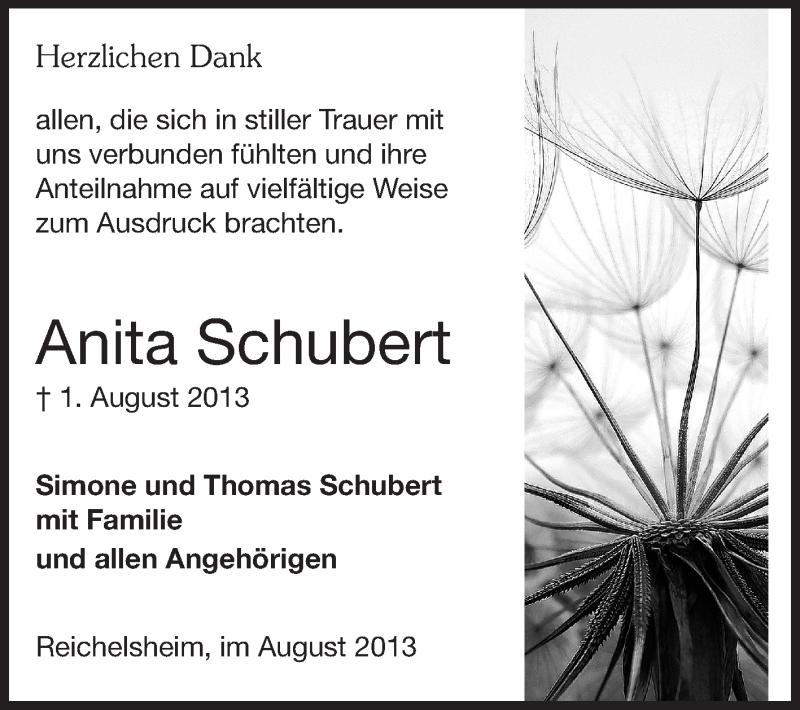 Hier finden Sie alle Traueranzeigen aus der Zeitung, die bisher für Anita Schubert erschienen sind. Weitere Traueranzeigen, die in der Zeitung erscheinen, werden hier ebenfalls aufgelistet