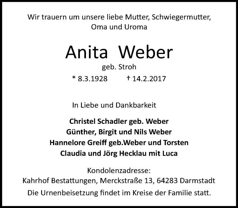 Hier finden Sie alle Traueranzeigen aus der Zeitung, die bisher für Anita Weber erschienen sind. Weitere Traueranzeigen, die in der Zeitung erscheinen, werden hier ebenfalls aufgelistet