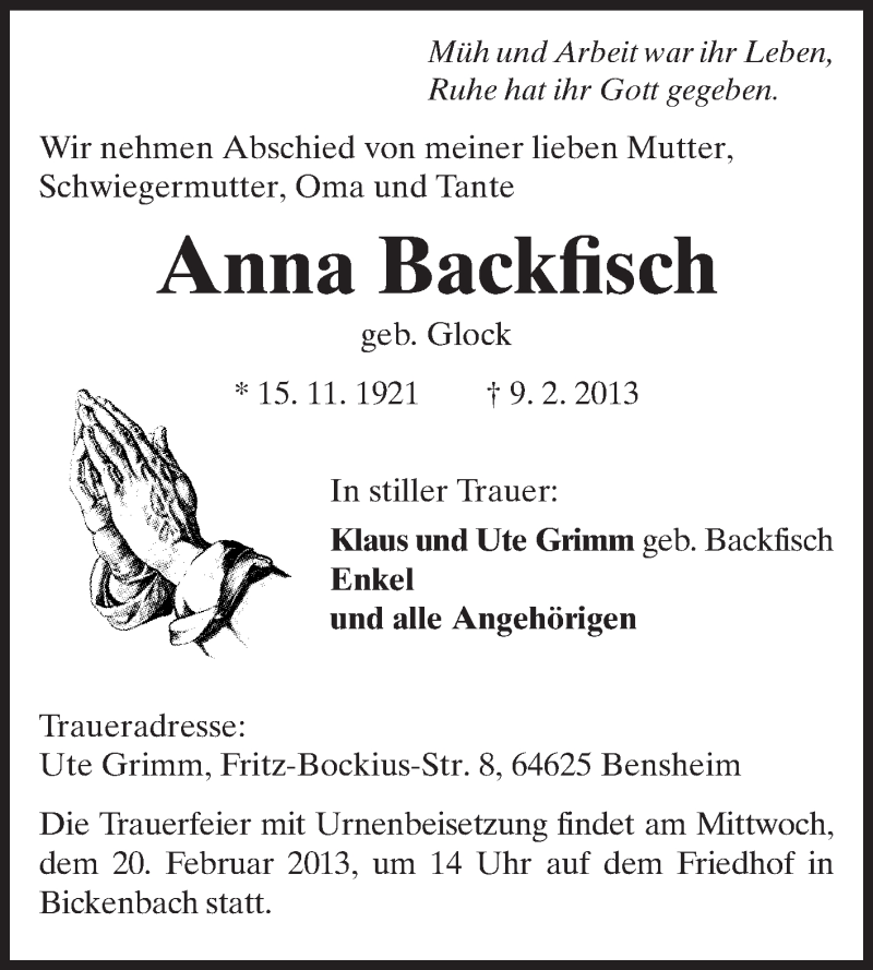Hier finden Sie alle Traueranzeigen aus der Zeitung, die bisher für Anna Backfisch erschienen sind. Weitere Traueranzeigen, die in der Zeitung erscheinen, werden hier ebenfalls aufgelistet