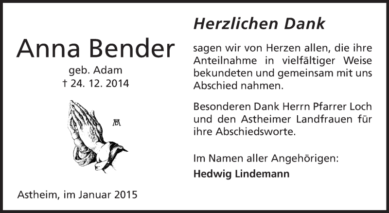 Hier finden Sie alle Traueranzeigen aus der Zeitung, die bisher für Anna Bender erschienen sind. Weitere Traueranzeigen, die in der Zeitung erscheinen, werden hier ebenfalls aufgelistet