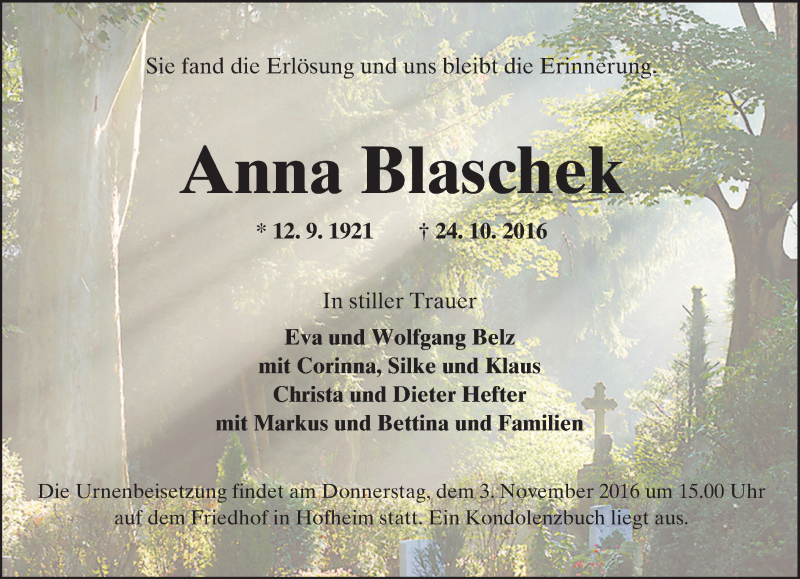 Hier finden Sie alle Traueranzeigen aus der Zeitung, die bisher für Anna Blaschek erschienen sind. Weitere Traueranzeigen, die in der Zeitung erscheinen, werden hier ebenfalls aufgelistet