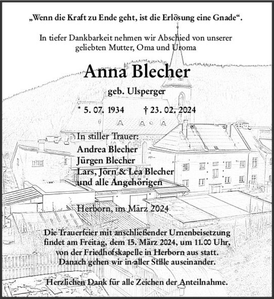 Hier finden Sie alle Traueranzeigen aus der Zeitung, die bisher für Anna Blecher erschienen sind. Weitere Traueranzeigen, die in der Zeitung erscheinen, werden hier ebenfalls aufgelistet