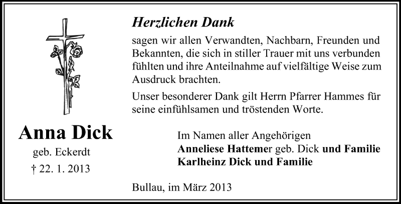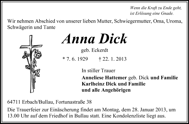 Hier finden Sie alle Traueranzeigen aus der Zeitung, die bisher für Anna Dick erschienen sind. Weitere Traueranzeigen, die in der Zeitung erscheinen, werden hier ebenfalls aufgelistet