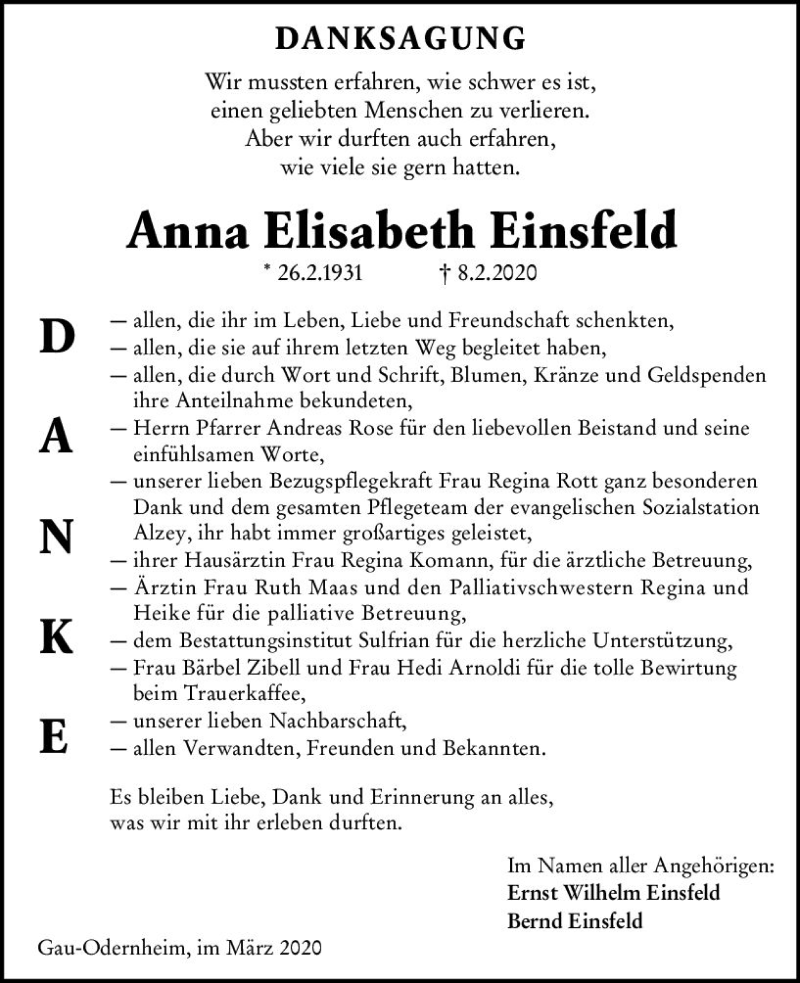 Hier finden Sie alle Traueranzeigen aus der Zeitung, die bisher für Anna Elisabeth Einsfeld erschienen sind. Weitere Traueranzeigen, die in der Zeitung erscheinen, werden hier ebenfalls aufgelistet
