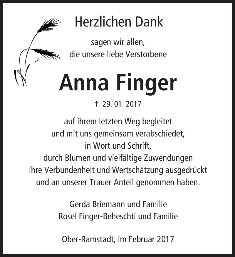 Hier finden Sie alle Traueranzeigen aus der Zeitung, die bisher für Anna Finger erschienen sind. Weitere Traueranzeigen, die in der Zeitung erscheinen, werden hier ebenfalls aufgelistet