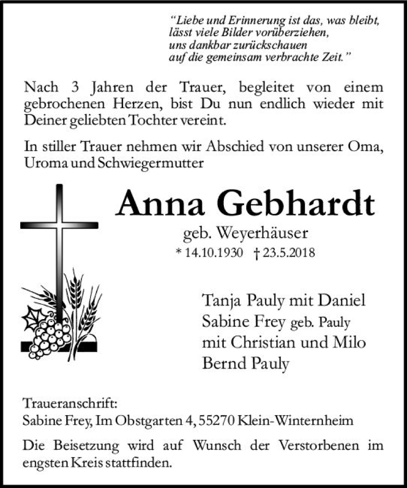 Hier finden Sie alle Traueranzeigen aus der Zeitung, die bisher für Anna Gebhardt erschienen sind. Weitere Traueranzeigen, die in der Zeitung erscheinen, werden hier ebenfalls aufgelistet