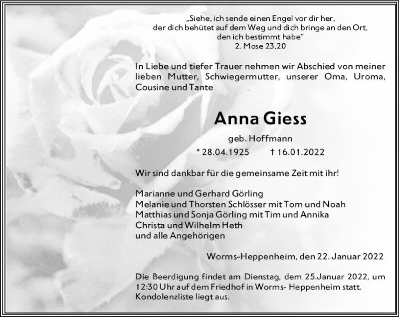 Hier finden Sie alle Traueranzeigen aus der Zeitung, die bisher für Anna Giess erschienen sind. Weitere Traueranzeigen, die in der Zeitung erscheinen, werden hier ebenfalls aufgelistet