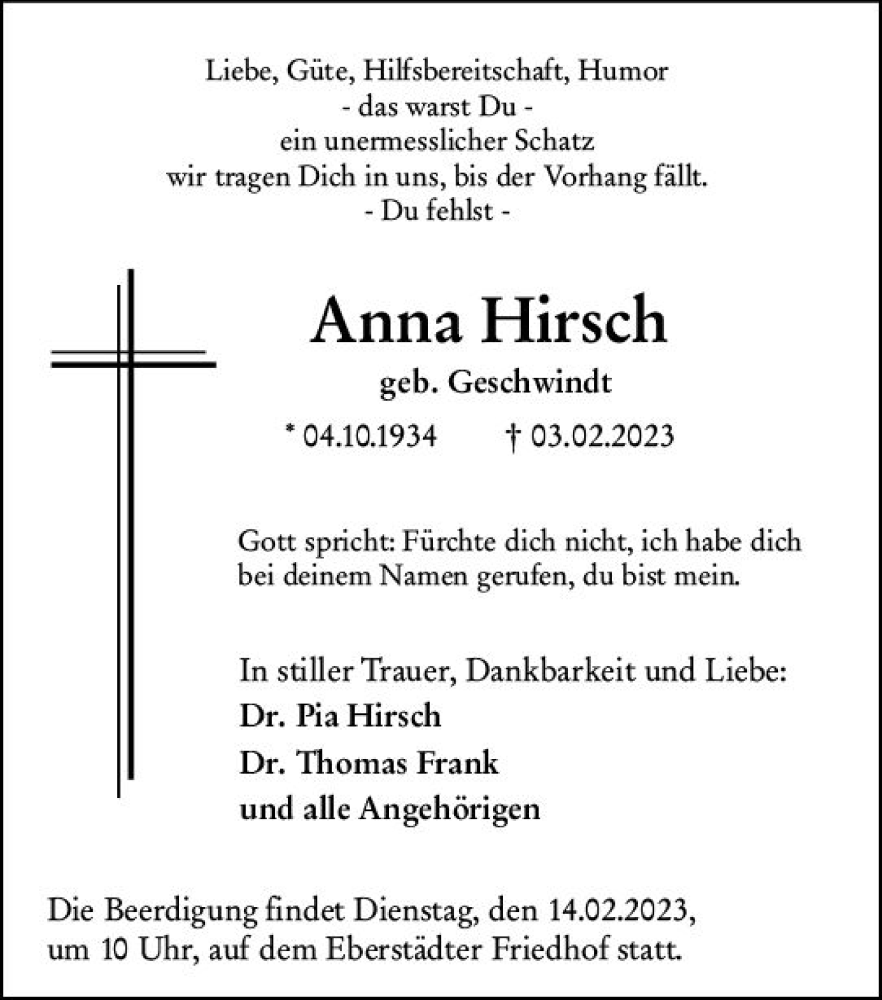 Hier finden Sie alle Traueranzeigen aus der Zeitung, die bisher für Anna Hirsch erschienen sind. Weitere Traueranzeigen, die in der Zeitung erscheinen, werden hier ebenfalls aufgelistet