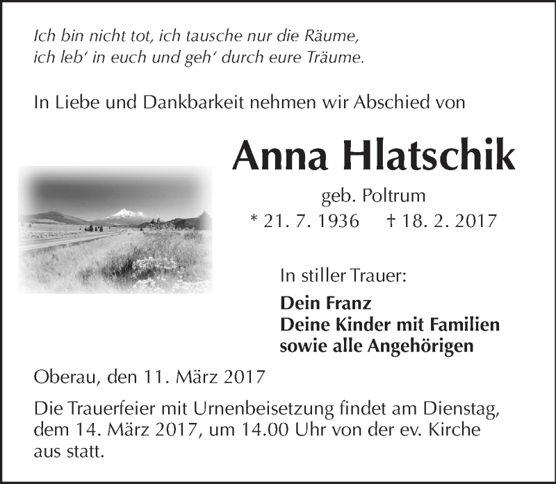 Hier finden Sie alle Traueranzeigen aus der Zeitung, die bisher für Anna Hlatschik erschienen sind. Weitere Traueranzeigen, die in der Zeitung erscheinen, werden hier ebenfalls aufgelistet