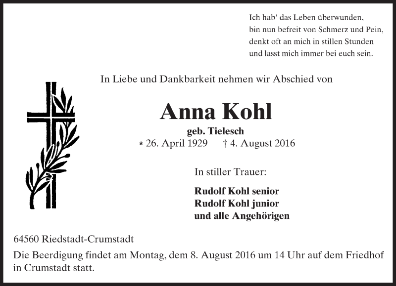 Hier finden Sie alle Traueranzeigen aus der Zeitung, die bisher für Anna Kohl erschienen sind. Weitere Traueranzeigen, die in der Zeitung erscheinen, werden hier ebenfalls aufgelistet