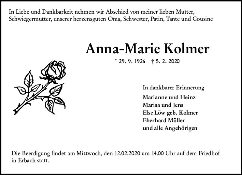Hier finden Sie alle Traueranzeigen aus der Zeitung, die bisher für Anna-Marie Kolmer erschienen sind. Weitere Traueranzeigen, die in der Zeitung erscheinen, werden hier ebenfalls aufgelistet
