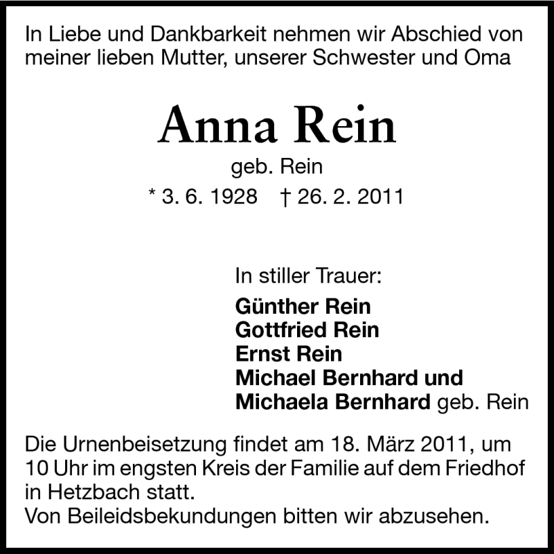 Hier finden Sie alle Traueranzeigen aus der Zeitung, die bisher für Anna Rein erschienen sind. Weitere Traueranzeigen, die in der Zeitung erscheinen, werden hier ebenfalls aufgelistet