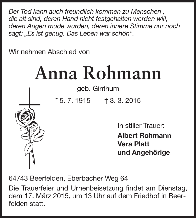 Hier finden Sie alle Traueranzeigen aus der Zeitung, die bisher für Anna Rohmann erschienen sind. Weitere Traueranzeigen, die in der Zeitung erscheinen, werden hier ebenfalls aufgelistet