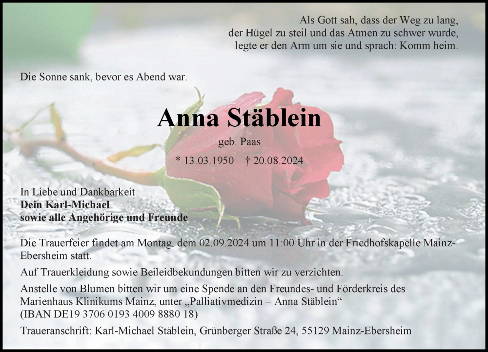 Hier finden Sie alle Traueranzeigen aus der Zeitung, die bisher für Anna Stäblein erschienen sind. Weitere Traueranzeigen, die in der Zeitung erscheinen, werden hier ebenfalls aufgelistet