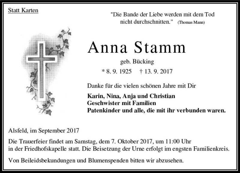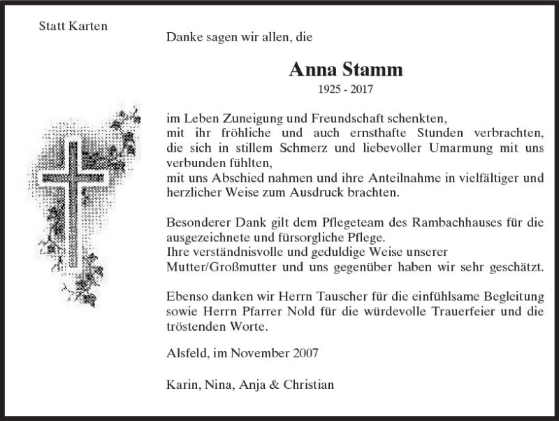 Hier finden Sie alle Traueranzeigen aus der Zeitung, die bisher für Anna Stamm erschienen sind. Weitere Traueranzeigen, die in der Zeitung erscheinen, werden hier ebenfalls aufgelistet