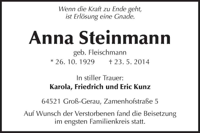 Hier finden Sie alle Traueranzeigen aus der Zeitung, die bisher für Anna Steinmann erschienen sind. Weitere Traueranzeigen, die in der Zeitung erscheinen, werden hier ebenfalls aufgelistet