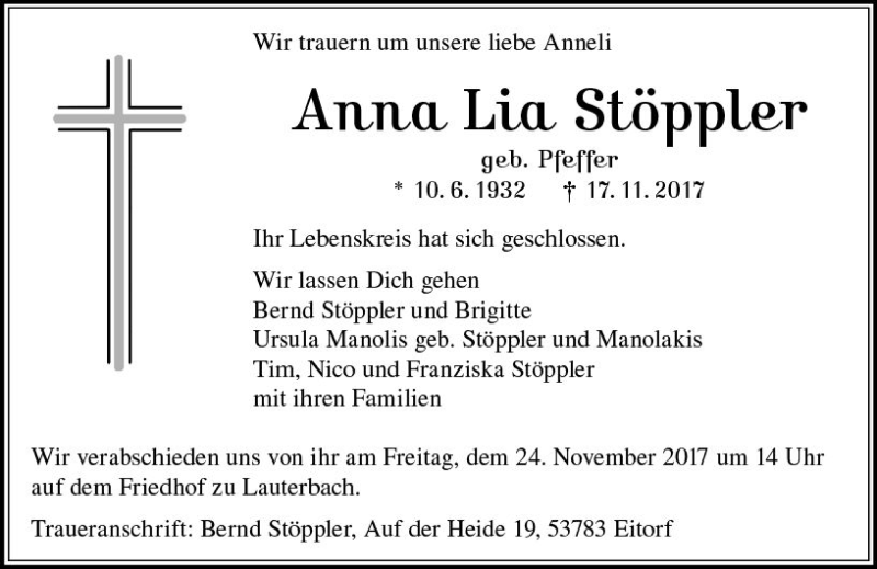 Hier finden Sie alle Traueranzeigen aus der Zeitung, die bisher für Anna Lia Stöppler erschienen sind. Weitere Traueranzeigen, die in der Zeitung erscheinen, werden hier ebenfalls aufgelistet