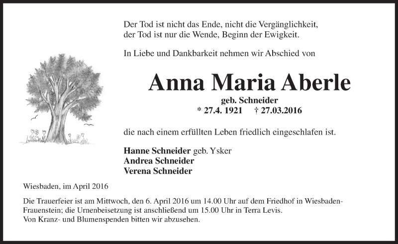 Hier finden Sie alle Traueranzeigen aus der Zeitung, die bisher für Anna Maria Aberle erschienen sind. Weitere Traueranzeigen, die in der Zeitung erscheinen, werden hier ebenfalls aufgelistet
