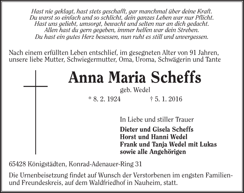 Hier finden Sie alle Traueranzeigen aus der Zeitung, die bisher für Anna Maria Scheffs erschienen sind. Weitere Traueranzeigen, die in der Zeitung erscheinen, werden hier ebenfalls aufgelistet