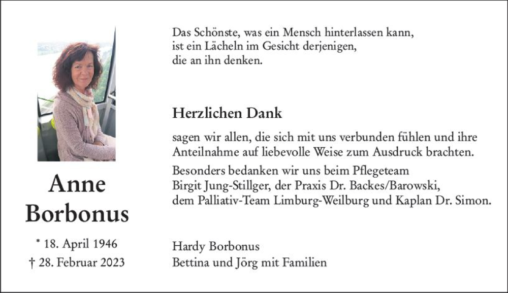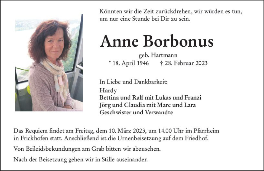 Hier finden Sie alle Traueranzeigen aus der Zeitung, die bisher für Anne Borbonus erschienen sind. Weitere Traueranzeigen, die in der Zeitung erscheinen, werden hier ebenfalls aufgelistet