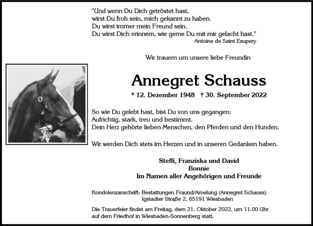 Hier finden Sie alle Traueranzeigen aus der Zeitung, die bisher für Annegret Schauss erschienen sind. Weitere Traueranzeigen, die in der Zeitung erscheinen, werden hier ebenfalls aufgelistet