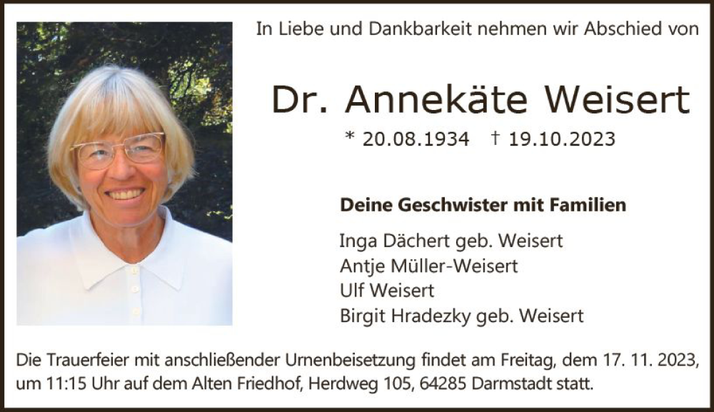 Hier finden Sie alle Traueranzeigen aus der Zeitung, die bisher für Annekäte Weisert erschienen sind. Weitere Traueranzeigen, die in der Zeitung erscheinen, werden hier ebenfalls aufgelistet