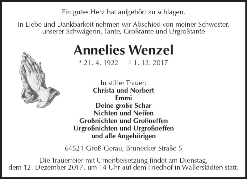 Hier finden Sie alle Traueranzeigen aus der Zeitung, die bisher für Annelies Wenzel erschienen sind. Weitere Traueranzeigen, die in der Zeitung erscheinen, werden hier ebenfalls aufgelistet