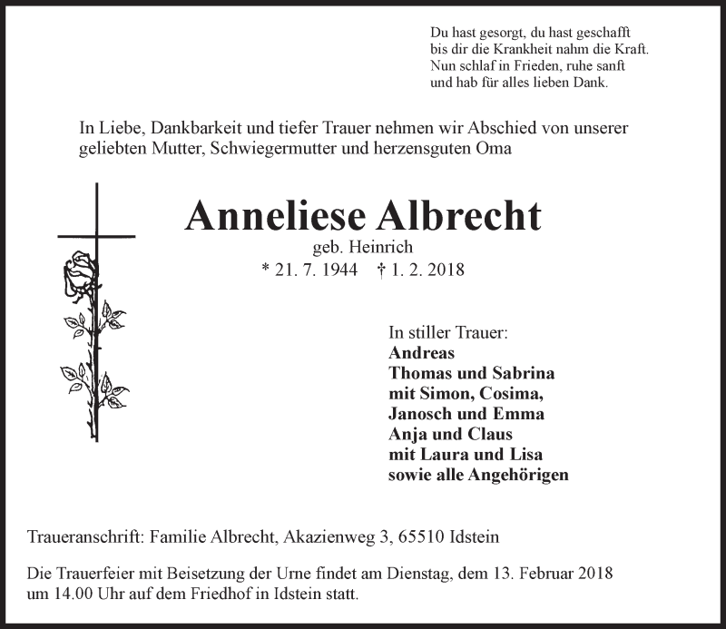 Hier finden Sie alle Traueranzeigen aus der Zeitung, die bisher für Anneliese Albrecht erschienen sind. Weitere Traueranzeigen, die in der Zeitung erscheinen, werden hier ebenfalls aufgelistet