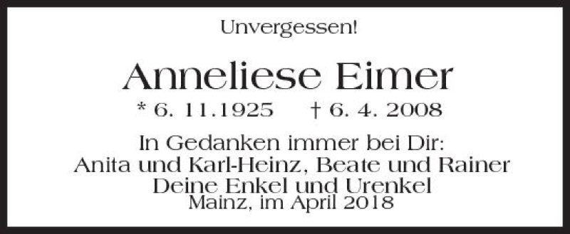 Hier finden Sie alle Traueranzeigen aus der Zeitung, die bisher für Anneliese Eimer erschienen sind. Weitere Traueranzeigen, die in der Zeitung erscheinen, werden hier ebenfalls aufgelistet
