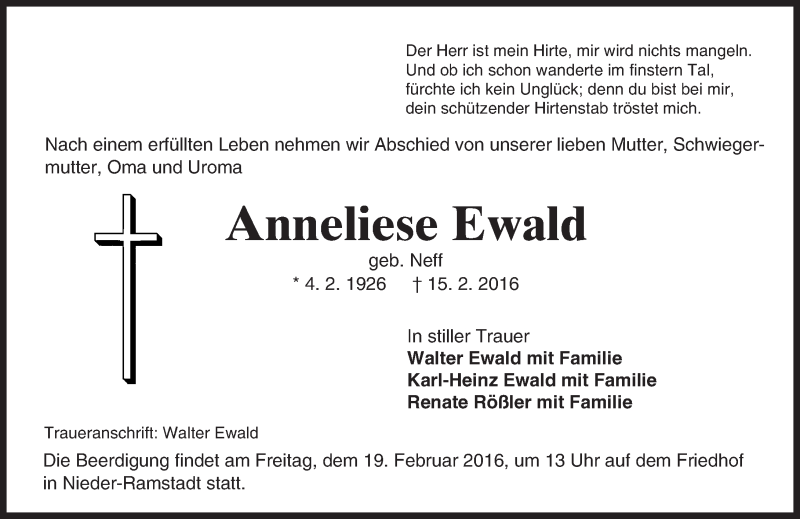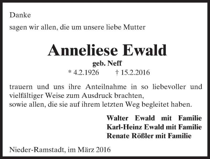 Hier finden Sie alle Traueranzeigen aus der Zeitung, die bisher für Anneliese Ewald erschienen sind. Weitere Traueranzeigen, die in der Zeitung erscheinen, werden hier ebenfalls aufgelistet