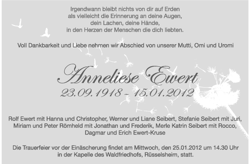 Hier finden Sie alle Traueranzeigen aus der Zeitung, die bisher für Anneliese Ewert erschienen sind. Weitere Traueranzeigen, die in der Zeitung erscheinen, werden hier ebenfalls aufgelistet