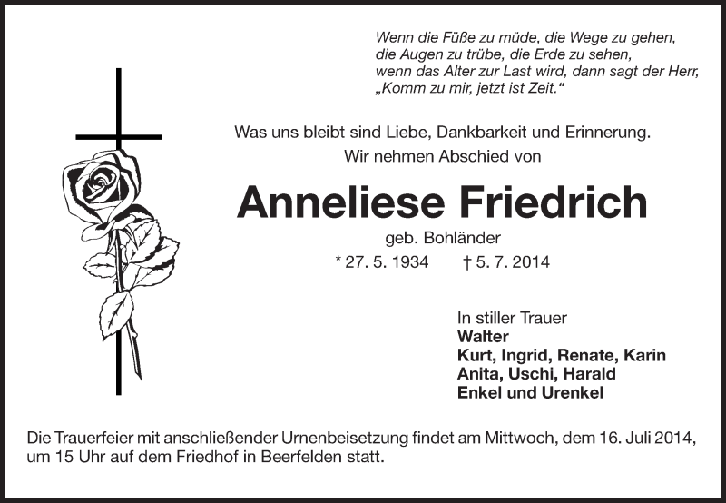 Hier finden Sie alle Traueranzeigen aus der Zeitung, die bisher für Anneliese Friedrich erschienen sind. Weitere Traueranzeigen, die in der Zeitung erscheinen, werden hier ebenfalls aufgelistet