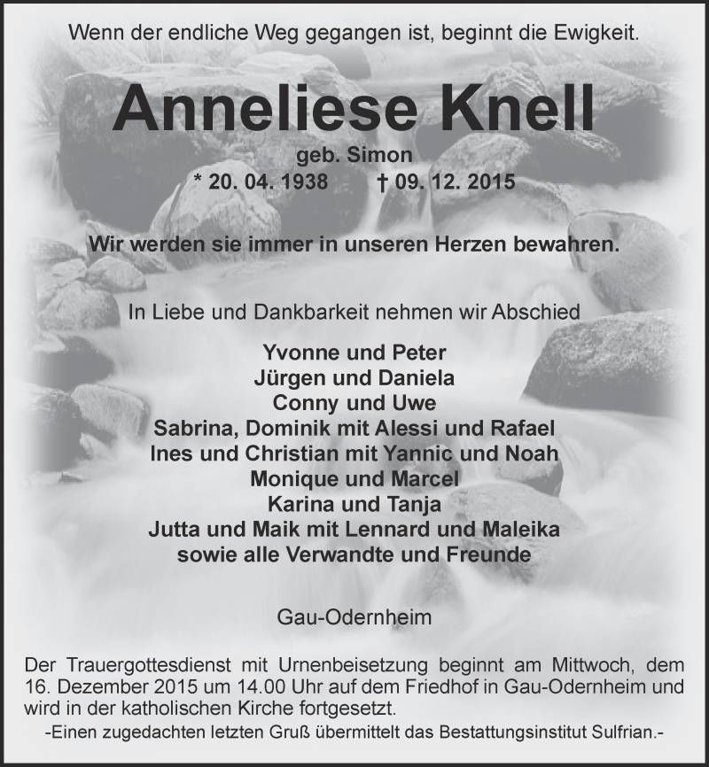 Hier finden Sie alle Traueranzeigen aus der Zeitung, die bisher für Anneliese Knell erschienen sind. Weitere Traueranzeigen, die in der Zeitung erscheinen, werden hier ebenfalls aufgelistet