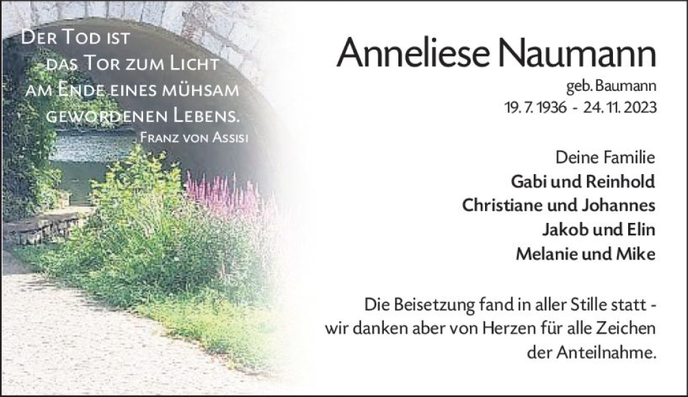 Hier finden Sie alle Traueranzeigen aus der Zeitung, die bisher für Anneliese Naumann erschienen sind. Weitere Traueranzeigen, die in der Zeitung erscheinen, werden hier ebenfalls aufgelistet