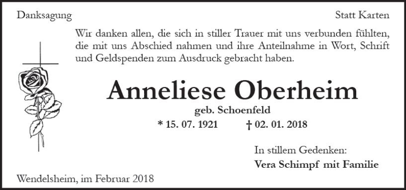 Hier finden Sie alle Traueranzeigen aus der Zeitung, die bisher für Anneliese Oberheim erschienen sind. Weitere Traueranzeigen, die in der Zeitung erscheinen, werden hier ebenfalls aufgelistet