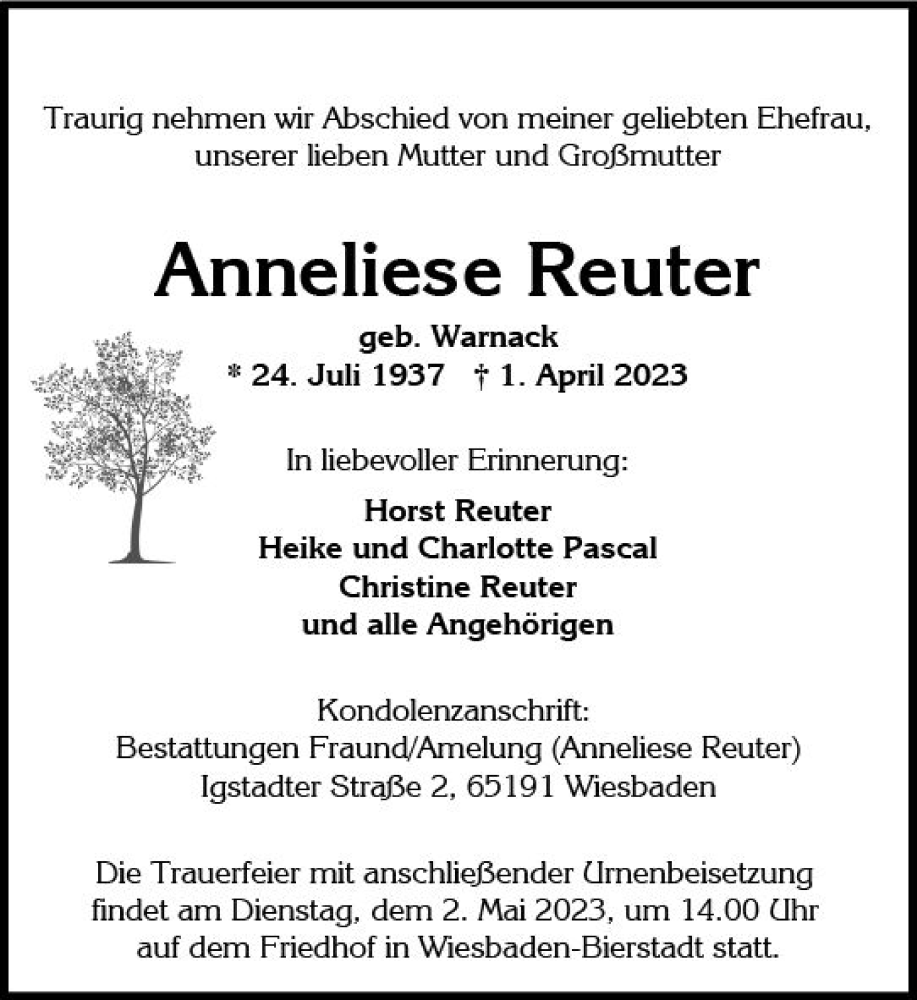 Hier finden Sie alle Traueranzeigen aus der Zeitung, die bisher für Anneliese Reuter erschienen sind. Weitere Traueranzeigen, die in der Zeitung erscheinen, werden hier ebenfalls aufgelistet