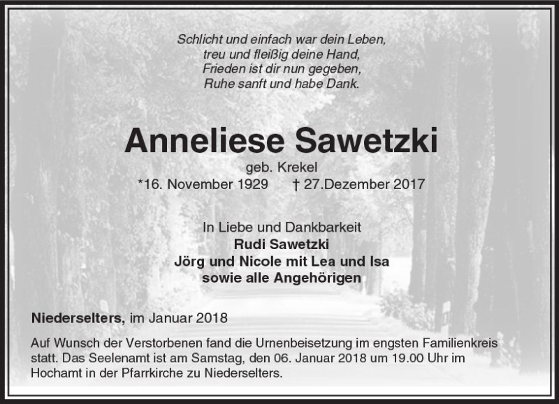 Hier finden Sie alle Traueranzeigen aus der Zeitung, die bisher für Anneliese Sawetzki erschienen sind. Weitere Traueranzeigen, die in der Zeitung erscheinen, werden hier ebenfalls aufgelistet