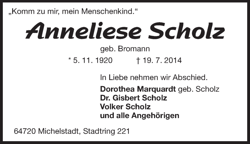 Hier finden Sie alle Traueranzeigen aus der Zeitung, die bisher für Anneliese Scholz erschienen sind. Weitere Traueranzeigen, die in der Zeitung erscheinen, werden hier ebenfalls aufgelistet