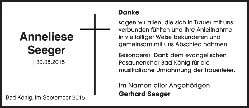 Hier finden Sie alle Traueranzeigen aus der Zeitung, die bisher für Anneliese Seeger erschienen sind. Weitere Traueranzeigen, die in der Zeitung erscheinen, werden hier ebenfalls aufgelistet