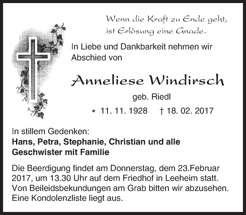 Hier finden Sie alle Traueranzeigen aus der Zeitung, die bisher für Anneliese Windirsch erschienen sind. Weitere Traueranzeigen, die in der Zeitung erscheinen, werden hier ebenfalls aufgelistet