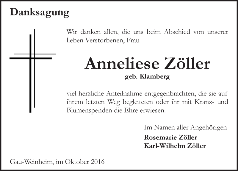 Hier finden Sie alle Traueranzeigen aus der Zeitung, die bisher für Anneliese Zöller erschienen sind. Weitere Traueranzeigen, die in der Zeitung erscheinen, werden hier ebenfalls aufgelistet