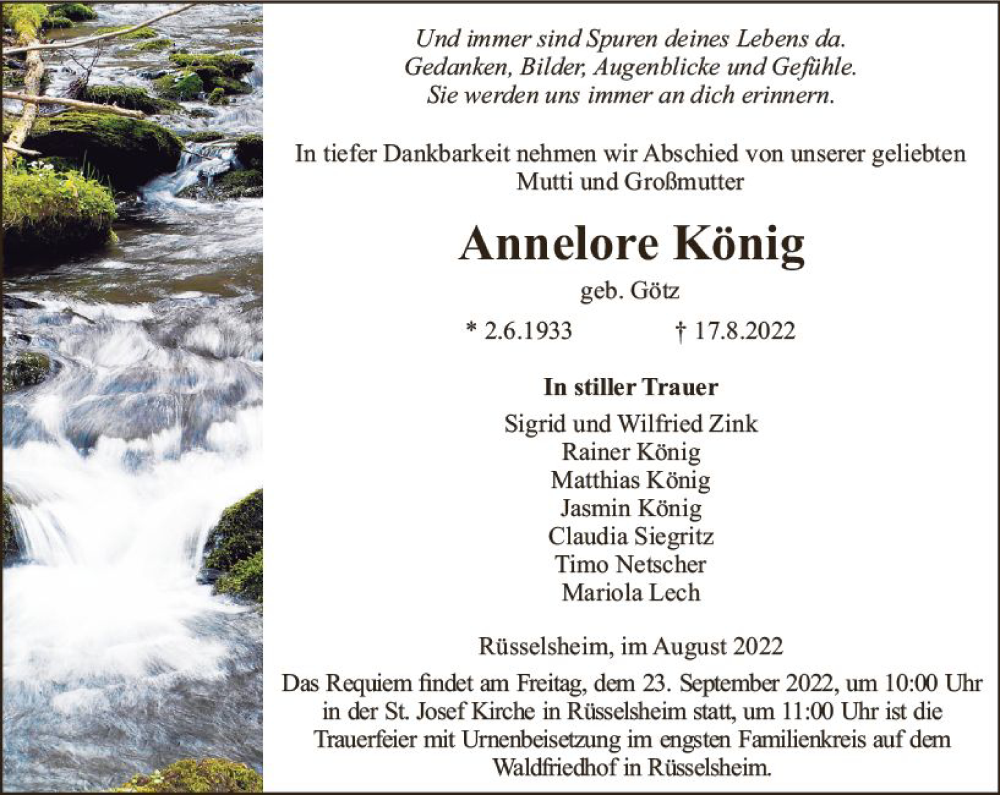 Hier finden Sie alle Traueranzeigen aus der Zeitung, die bisher für Annelore König erschienen sind. Weitere Traueranzeigen, die in der Zeitung erscheinen, werden hier ebenfalls aufgelistet
