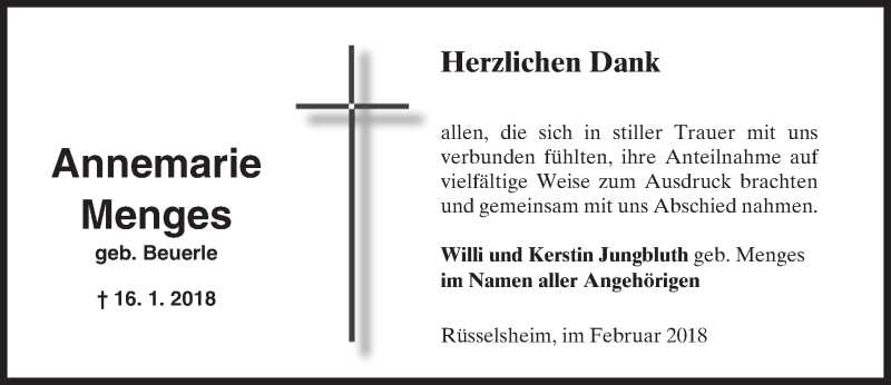 Hier finden Sie alle Traueranzeigen aus der Zeitung, die bisher für Annemarie Menges erschienen sind. Weitere Traueranzeigen, die in der Zeitung erscheinen, werden hier ebenfalls aufgelistet