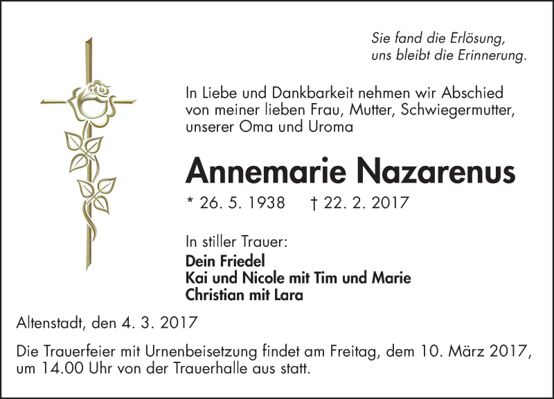 Hier finden Sie alle Traueranzeigen aus der Zeitung, die bisher für Annemarie Nazarenus erschienen sind. Weitere Traueranzeigen, die in der Zeitung erscheinen, werden hier ebenfalls aufgelistet