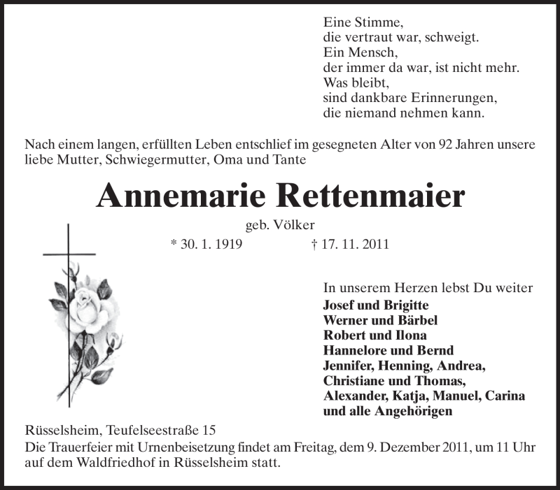 Hier finden Sie alle Traueranzeigen aus der Zeitung, die bisher für Annemarie Rettenmaier erschienen sind. Weitere Traueranzeigen, die in der Zeitung erscheinen, werden hier ebenfalls aufgelistet